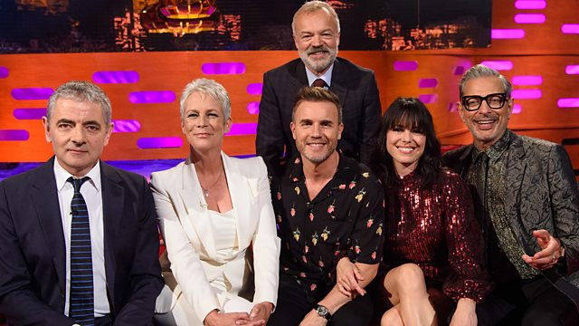 Together on Graham's sofa: comedy genius Rowan Atkinson, actress Jamie Lee Curtis, pop star Gary Barlow, and Hollywood king of cool Jeff Goldblum, who chats and performs 'Straighten Up and Fly Right' with Imelda May.